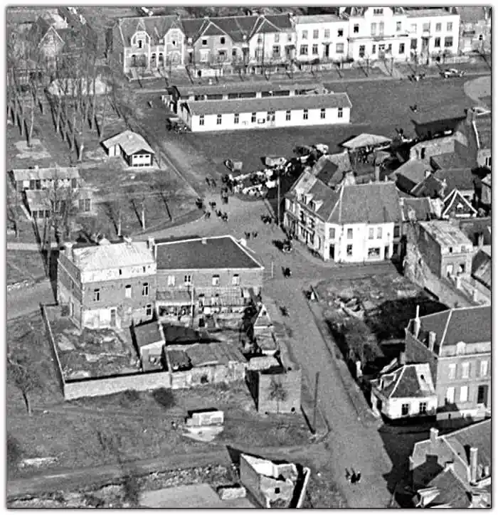 L’esplanade de Bouchain un jour de marché, au lendemain de la Seconde Guerre mondiale (vers 1947). La poste, inaugurée en 1924, occupe le centre de la place. À sa gauche se trouve la perception, et à sa droite les bureaux de l’enregistrement. Sur l’esplanade a également été installée une mairie provisoire.